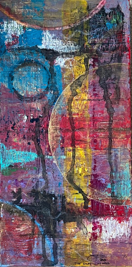 The Story in My Head: 10″ x 20″ mixed media on canvas